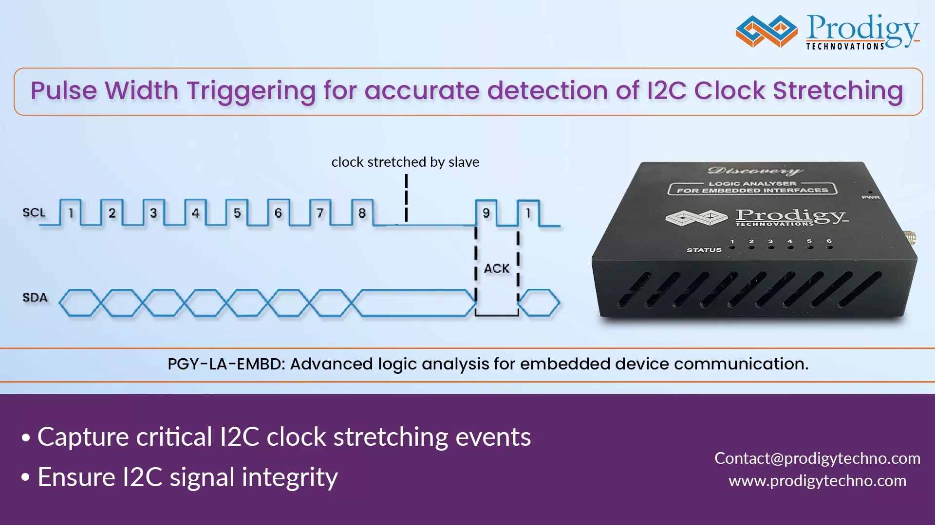 The PGY-LA-EMBD, a high-performance logic analyzer, offers advanced features for analyzing I2C signals, including pulse width triggering of clock stretching. This document provides an overview of how pulse width triggering on clock stretching can be achieved using the PGY-LA-EMBD logic analyzer.