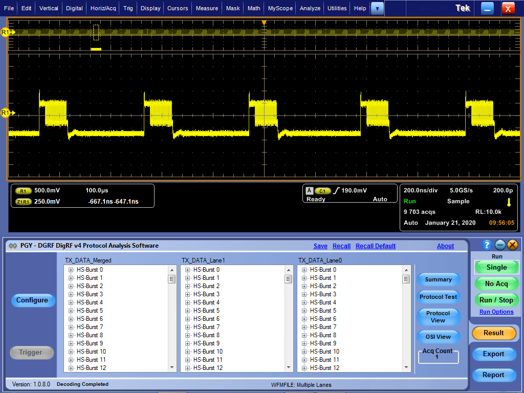 DigRF v4 Protocol Decode Software offers protocol decoding as specified in the DigRF v4 specification. PGY-DigRF v4 Protocol decode software runs in Tektronix Oscilloscope and provides measurements for protocol decode at the click of a button. This allows engineers to quickly check for DigRF v4 compliance and flexibility to debug the failure. In addition to this, engineers can decode the command and response of DigRF v4 to debug the communication. PGY-DigRF v4 takes advantage of the digital channels of MSO and provides the decoding of DigRF v4 data lines.