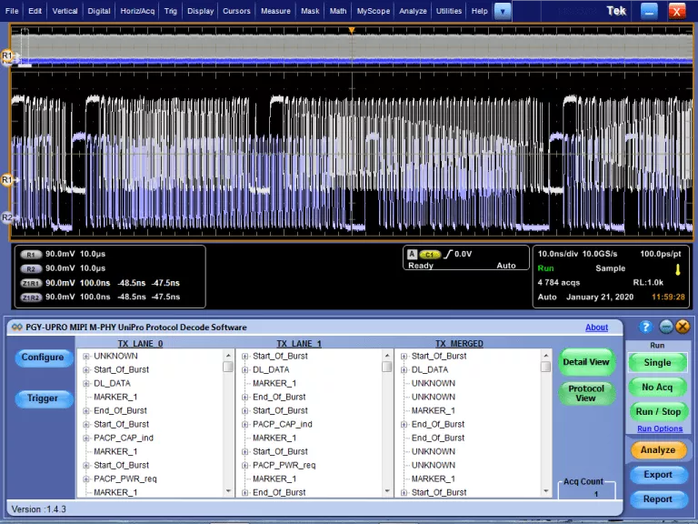 The PGY-UPRO/LLI/UFS Protocol Decode Software offers extensive protocol decoding for MIPI-MPHY-UniPRO, LLI, and UFS protocol standards. This software offers Real-time hardware-based UniPRO/UFS Protocol aware triggers for PWM, NRZ, and 8B/10B data types. Now design and test engineers can automatically make accurate and reliable decode of multi-lane UniPRO/LLI/UFS using PGY-UPro/LLI/UFS software using data acquired by Tektronix, DPO/DSA/MSO70000 oscilloscope series to reduce the development and test cycle.