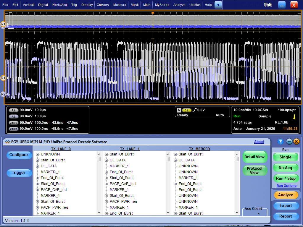 UFS Protocol Decode Software offers protocol decoding as specified in the UFS specification. PGY-UFS Protocol decode software runs in Tektronix Oscilloscope and provides measurements for protocol decode at the click of a button. This allows engineers to quickly check for UFS compliance and flexibility to debug the failure. In addition to this, engineers can decode the command and response of UFS to debug the communication. PGY-UFS takes advantage of the digital channels of MSO and provides the decoding of UFS data lines.