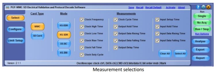 • eMMC and SD (UHS-I) electrical measurements and Protocol testing software conform to eMMC version 4.51, 5.0, 5.1 and SD version 3.01 specification