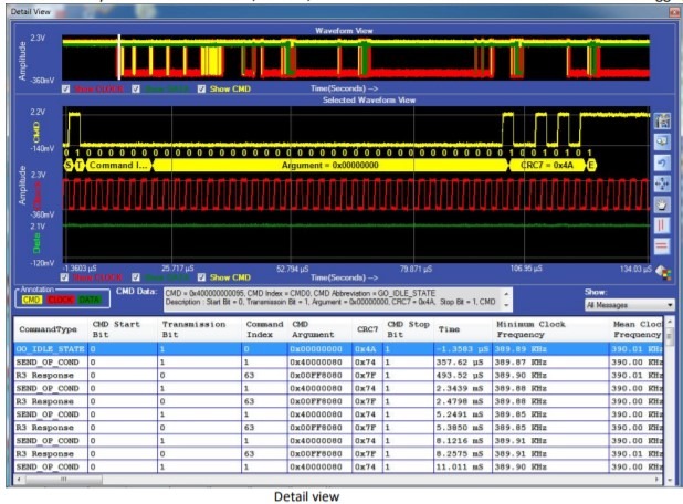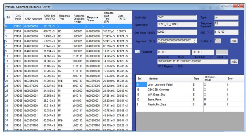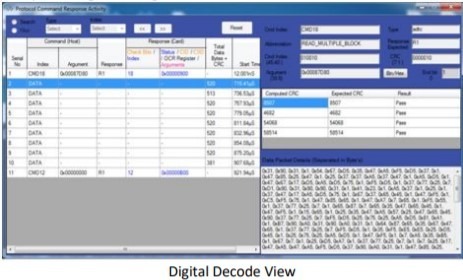 PGY-MMC-SD software lists all the protocol activity between the host and card. Engineers can now quickly view the command and its corresponding response from the card. Selected protocol activity details are listed on the right side of the list table. Now Engineers can know the errors reported by card or any other message to host without struggling to know the content of each message.