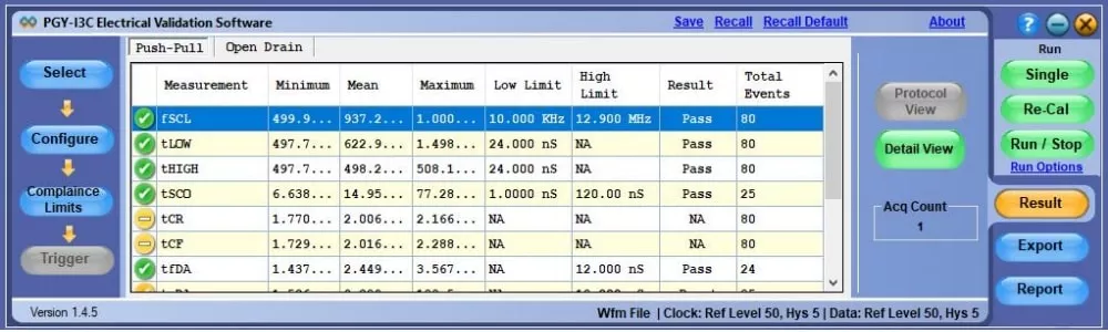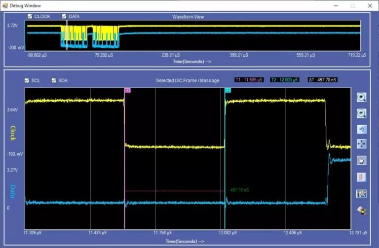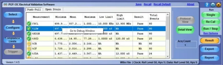 PGY-I3C-EV Software provides two types of debugging capabilities. In one of them, the worst-case result can be selected and linked directly to the waveform as shown here. The software provides the flexibility to define the number of acquisitions and the results will include worst-case results for all these acquisitions. The software can link the worst-case results to corresponding waveform acquisition using a simple right click of a mouse.