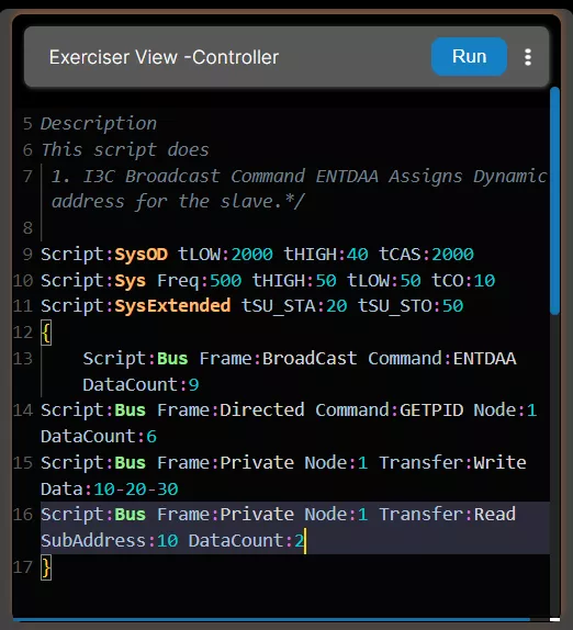 The script performs device enumeration by issuing the Broadcast ENTDAA CCC, which enables the controller to assign dynamic addresses to all connected targets. following which the controller sends a Directed GETPID command to retrieve the Provisional ID (PID) of the assigned target, ensuring proper device identification. Following this, the controller performs a private SDR write operation to transmit data into a specific register, and subsequently executes a private SDR read from the same register to validate the transaction by confirming that the written data has been correctly stored. The entire sequence is executed at a bus frequency of 500 kHz with a 50% duty cycle. Users can configure various timing parameters as per their test scenario.