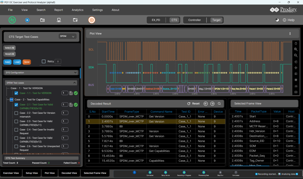 DMTF offers a list of SPDM Conformance Test Cases which are integrated with PGY-I3C-EX-PD. User can select each test case and drive the relevant SPDM Protocol traffic to the DUT using off the shelf test cases. The response of the DUT is analyzed and test result is reported by PGY-I3C-EX-PD. The tester can also generate the test report for records.