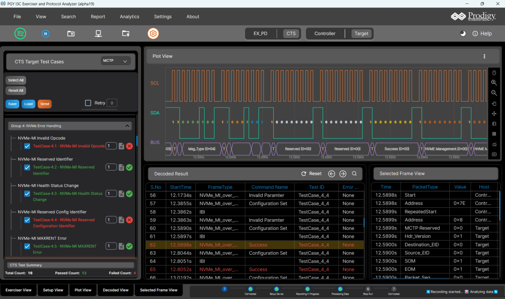 User Can Select each or all test cases and drive the NVMe-MI traffic to device under test. The software will automatically analyze the device response and provide pass/fail results.