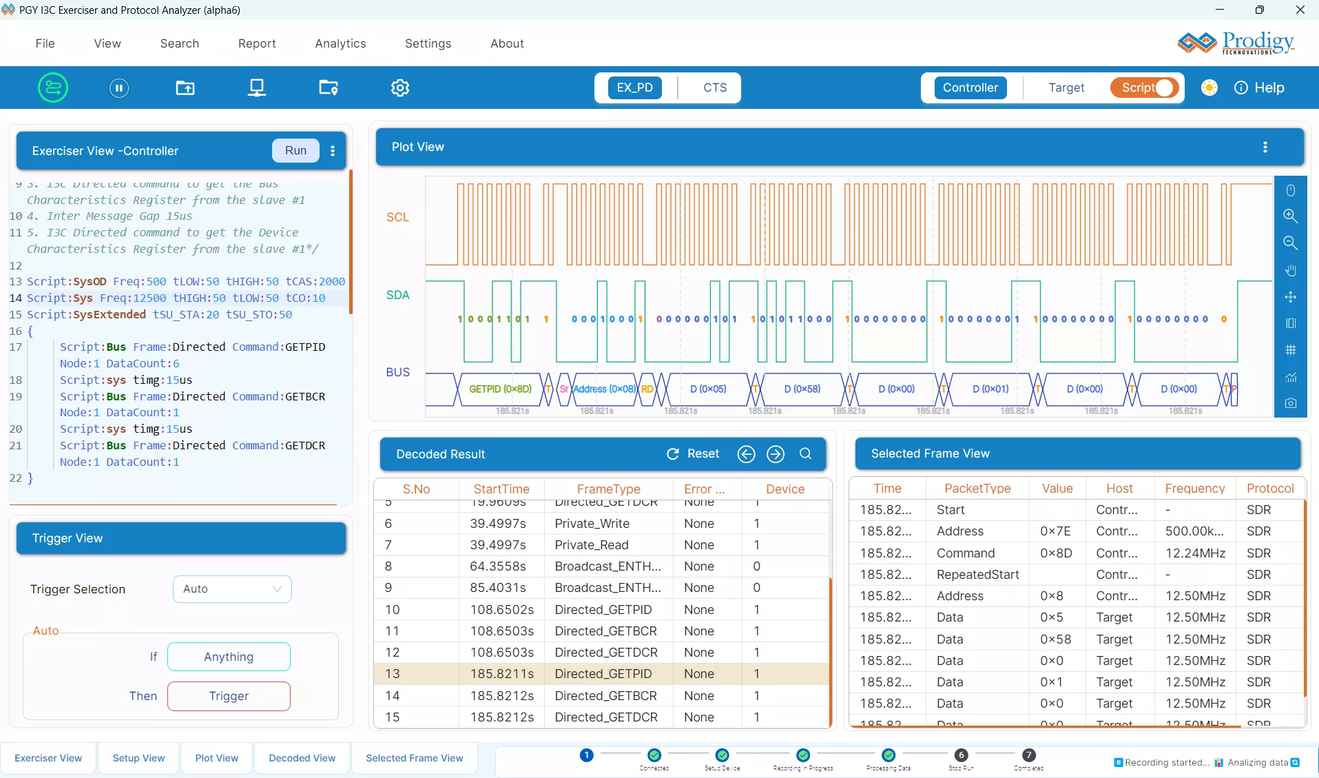 Multi-domain View provides the complete view of I3C Protocol activity in a single GUI. Users can easily set up the analyzer to generate I3C/I2C traffic using the GUI or script. Users can set different trigger conditions from the setup menu to capture protocol activity at specific events and decode the transactions between the controller and target. The decoded results can be viewed in the timing diagram and protocol listing window with auto-correlation. This comprehensive view of information makes it an industry- best offering and an easy to-use solution to debug the I3C protocol activity.