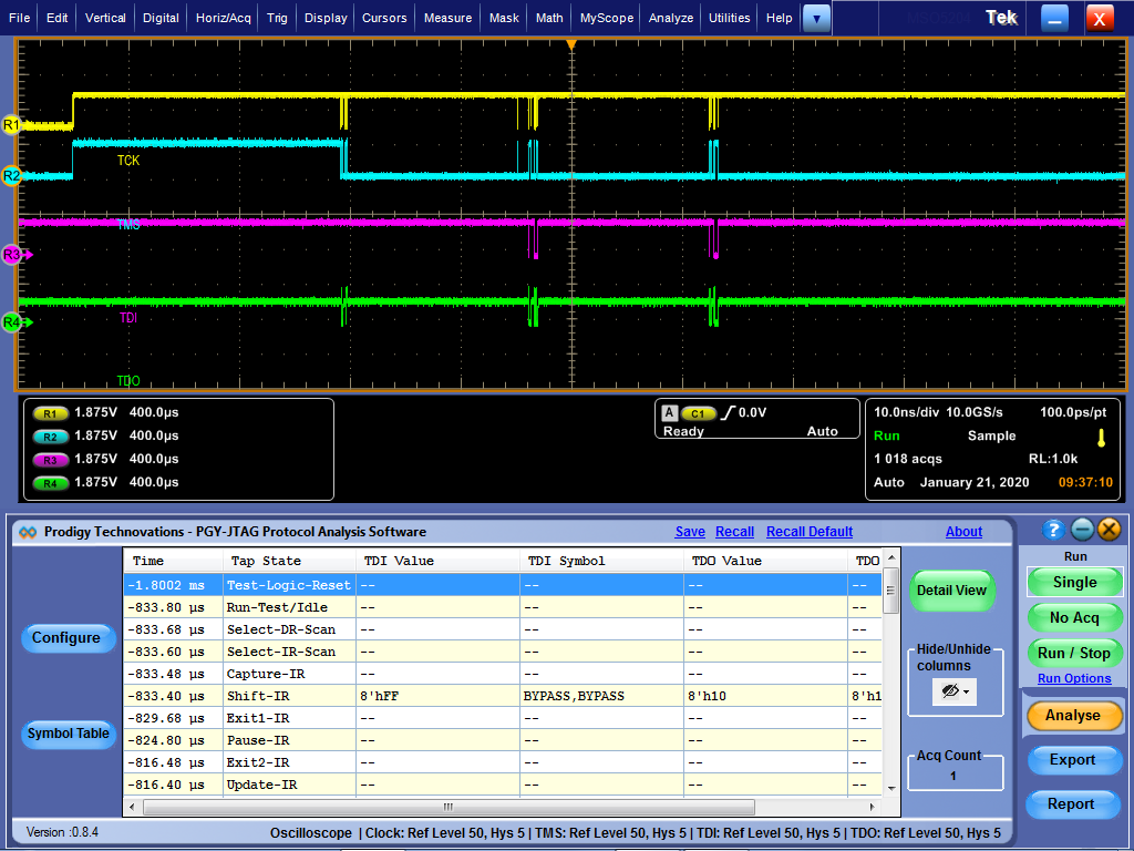 • JTAG Protocol Analysis using Tektronix oscilloscope live analog and digital channel data and saved files