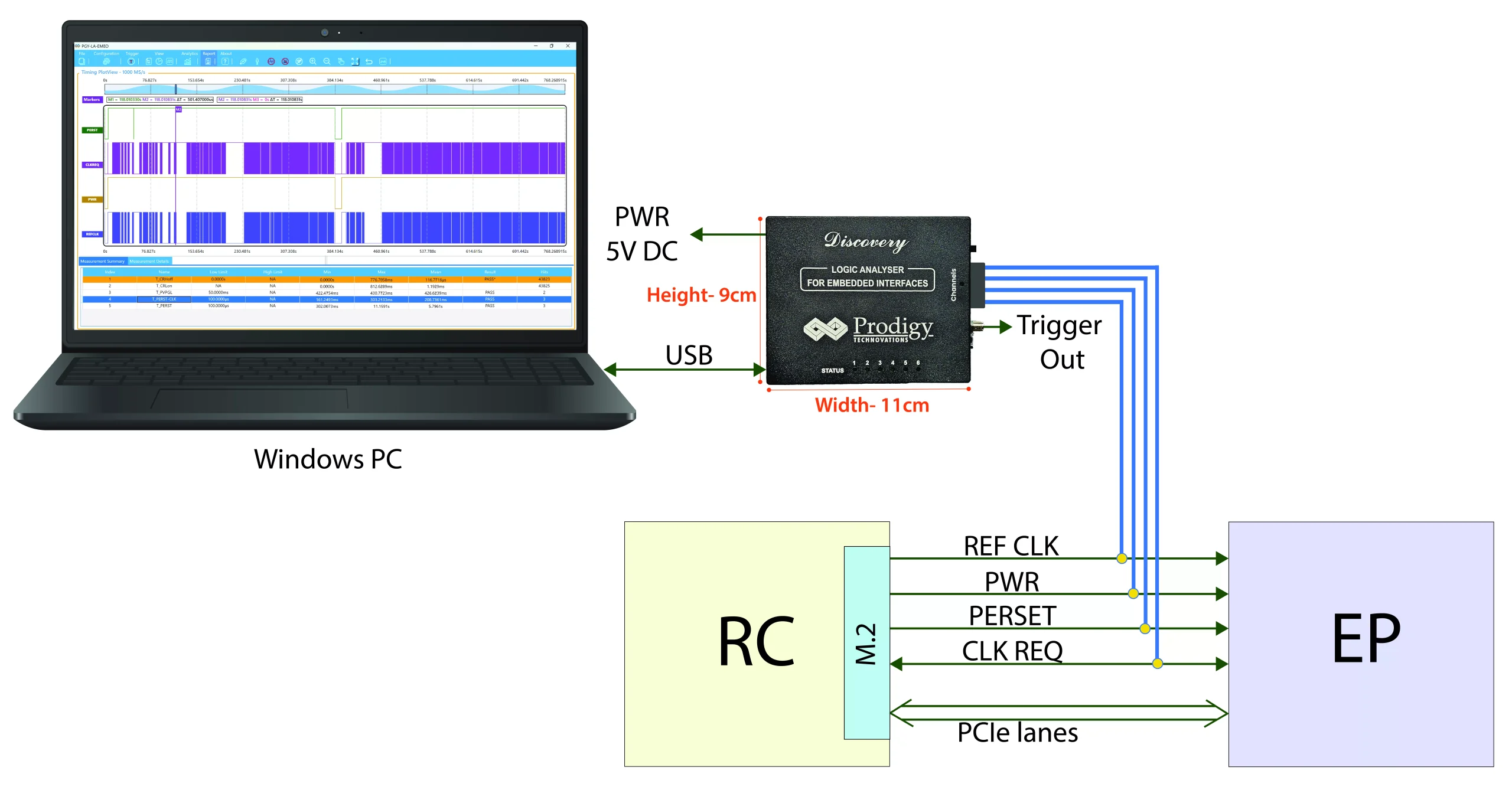 PGY-PCIeLP-SBA has M.2 extender board with access to all side band signals which can be connected to PCIe Low Power Side Band Signal Analyzer. The software runs in windows PC enables the configuration of Analyzer for measurements and trigger conditions. It continuously plots the timing waveforms and updates timing measurements summary statistical and detail information.