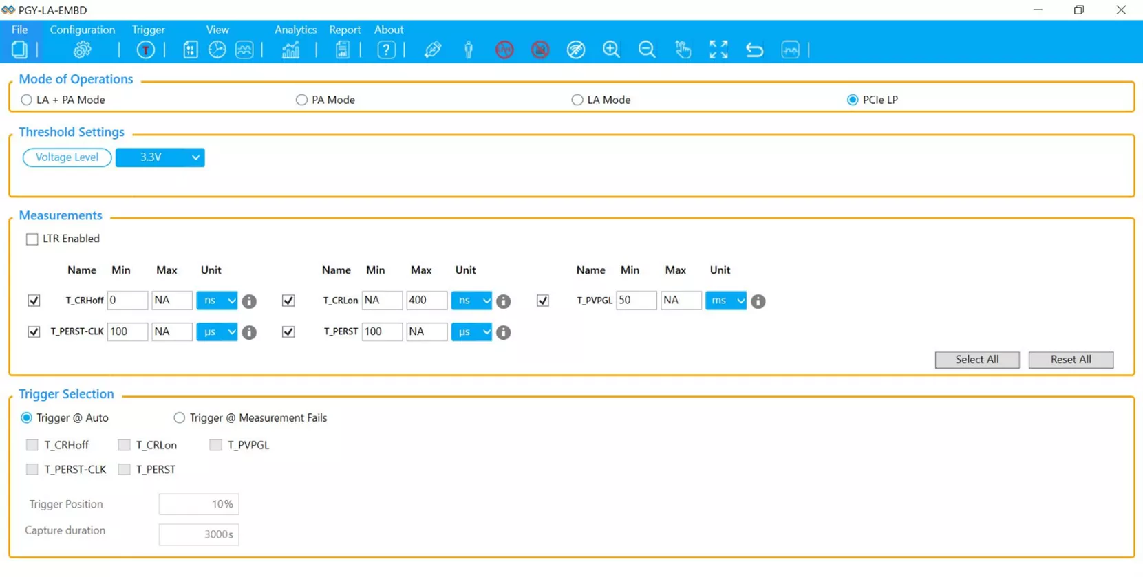 Configuration allows the users to easily select the timing parameters to be measured and set the trigger on any of this timing parameter failure. User can decide the duration of the capture in time (it can be few hours) or manually can stop the analysis. Pre and post trigger selection gives the option to view the data around the trigger condition.