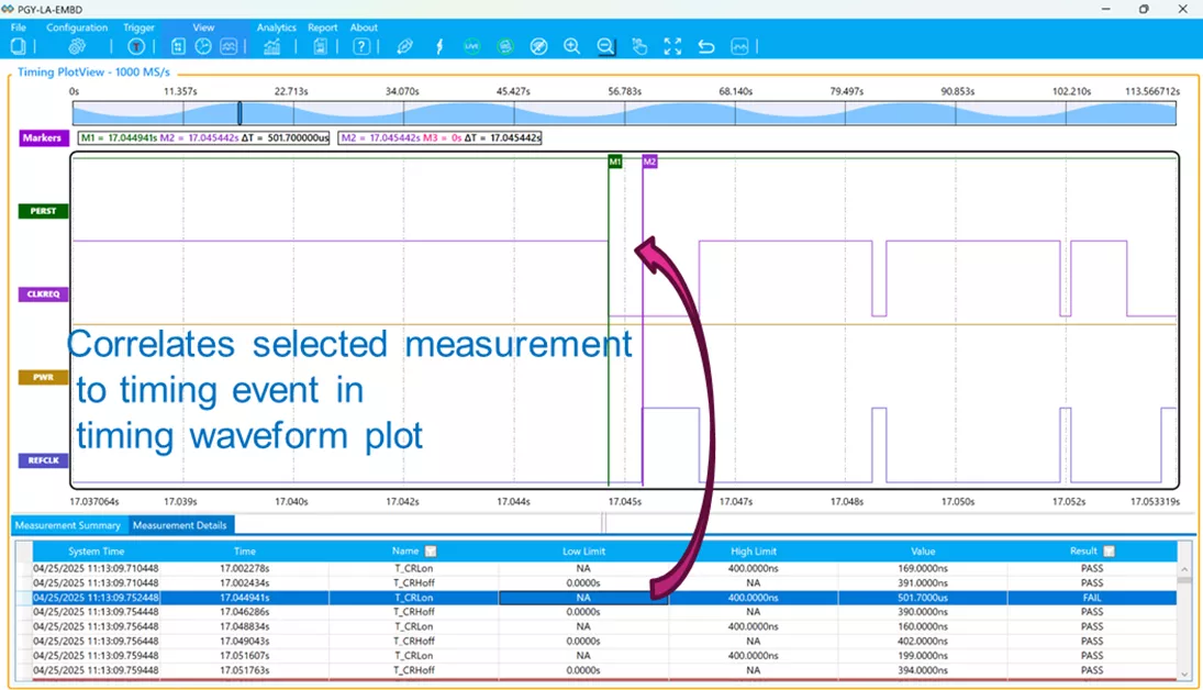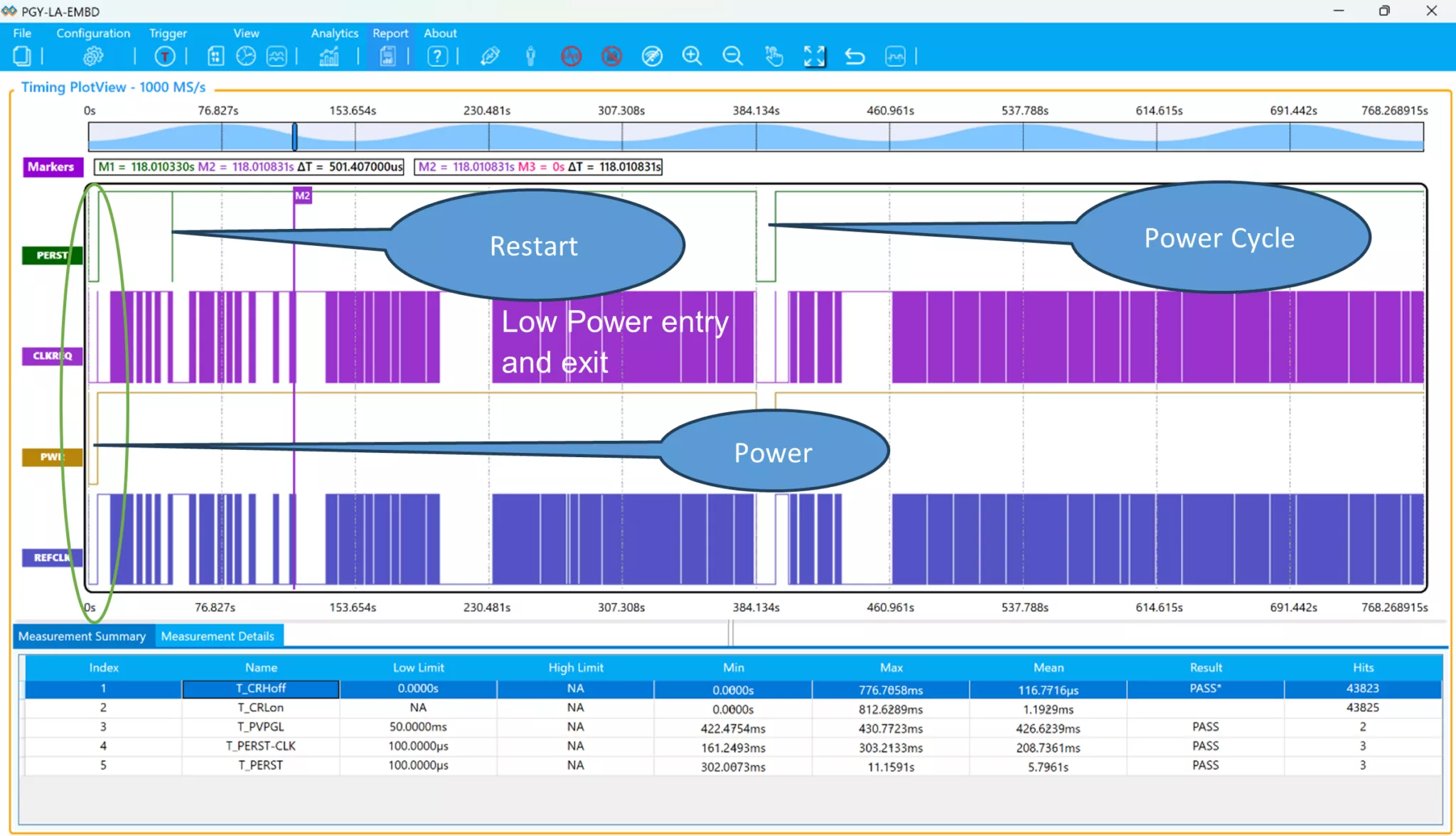 The applicable timing measurements for each event is measured and displayed in the software along with timing waveforms. The timing plot display PWR, CLKREQ, PERSET and REFCLK. The REFCLK is plotted at abstract layer, whenever it changes the state to 100MHz as displayed as high state and off state is displayed in low state. The acquisition duration is limited by the user need. The acquired data is continuously streamed to host computer storage system.