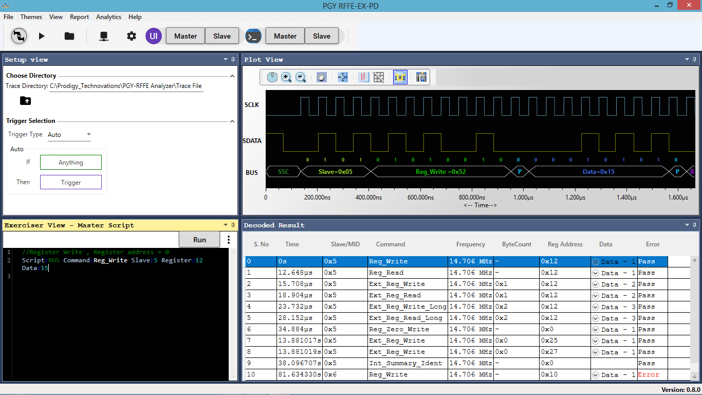 PGY-RFFE-EX-PD supports RFFE traffic generation using GUI and Script. Users can generate simple traffic generation using the GUI to test the DUT. Script-based GUI provides flexibility to emulate the complete expected traffic in the real-world including error injections. In this sample script user can generate RFFE traffic as below: