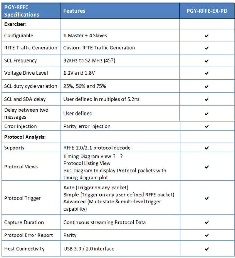 RFFE Protocol Analyzer (PGY-RFFE-EX-PD) is the Protocol Analyzer with multiple features to capture and debug communication between the host and design under test. The RF Front-end control interface (RFFE) Serial bus interface is emerging as a chosen for controlling RF frond-end devices. There is a variety of front-end devices such as Power Amplifiers (PA), Low-Nose Amplifiers (LNA), filters, switches, power management modules, and antenna tuners. It is widely used in mobile devices.