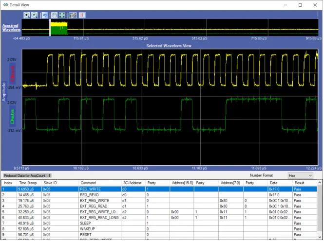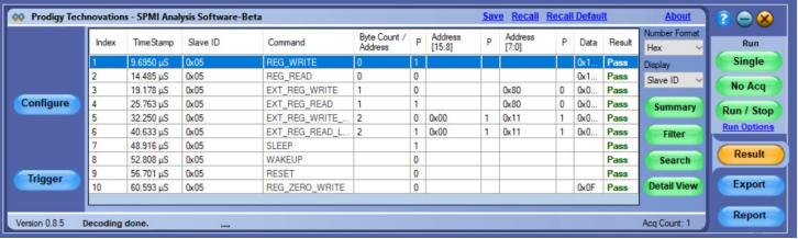 Protocol Summary provides a quick result view of protocol analysis of SPMI signals. This view lists pass/fail status of SSC, parity bit in command, address and data in the acquired data. This helps in locating the cause of SPMI Protocol packet failure.