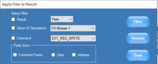 It is extremely challenging to view information of interest while there are hundreds of protocol transactions taking place between various devices. These problems compound during protocol analysis of a long record length. PGY-SPMI software solves this problem using the filter feature. By filtering information for Slave ID or specific command, or parity error type, the user can view only specific data of interest. Filters provide filtering of information using individual packet content or a combination of packet contents.