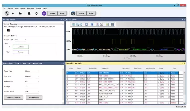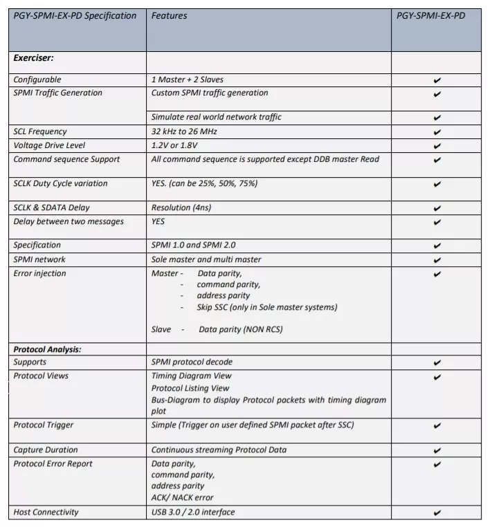 PGY-SPMI-EX-PD is the leading instrument that enables the design and test engineers to test the SPMI designs for its specifications by configuring PGY-SPMI-EX-ED as master/slave, generating SPMI traffic with time variation and error injection capability and decoding SPMI Protocol packets.