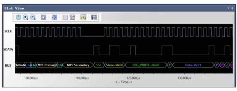 The timing view provides the plot of SCKL and SDATA signals with a bus diagram. Overlaying of Protocol bits on the digital timing waveform will help easy debugging of Protocol decoded data. Cursor and Zoom features will make it convenient to analyze Protocol in the timing diagram for any timing errors.