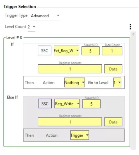 PGY-SPMI-EX-PD supports simple trigger capabilities. The analyzer can trigger on any of the Protocol packets such as Reg Write, SLEEP or WAKE UP. Advanced Trigger provides the flexibility to monitor Multiple trigger conditions and can set multiple state trigger machines. Users can initiate a timer and trigger onset timer values.